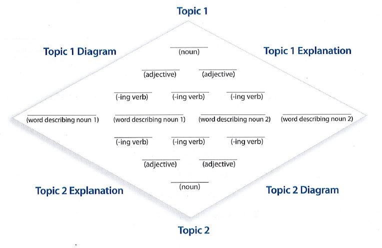 A diamante poem compares and contrasts two terms. The top three lines describe Topic 1 and the bottom three lines describe Topic 2. The middle line has two words for Topic 1 and two words for Topic 2. The poem should make sense and convey a clear thought, even though you have a limited number of words.